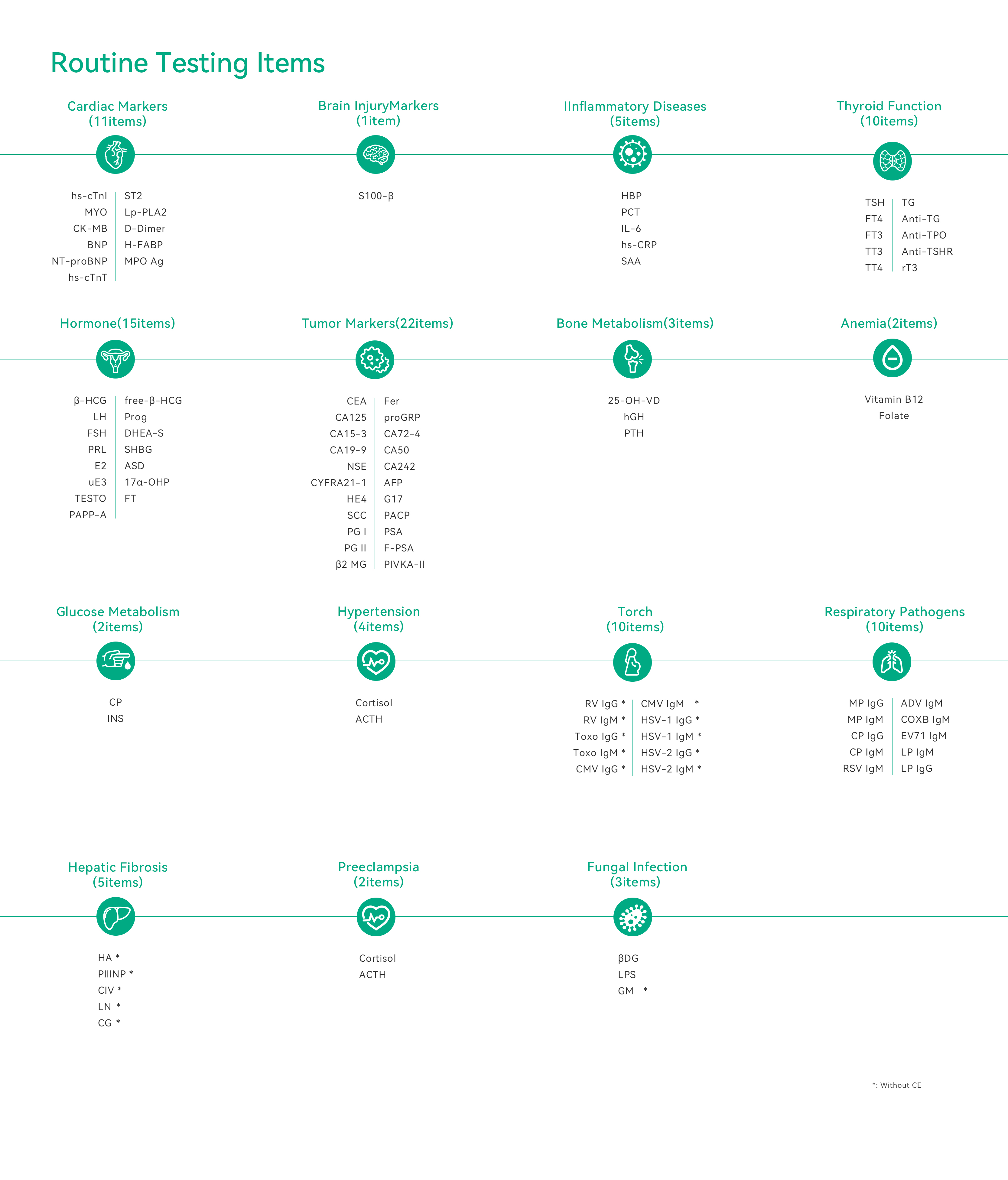 Routine Testing Items of C-Luminary Biotech includes myocardial markers, brain injury markers, inflammatory infections, thyroid function, sex hormones, tumor markers, bone metabolism, anemia, glucose metabolism, hypertension, eugenics, respiratory pathogens, etc.